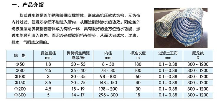 透水管是以防銹彈簧圈支撐管體,形成高抗壓軟式結構,無紡布內襯過濾,使泥砂雜質不能進入管內,從而達到凈滲水的功能。滌綸絲外繞祉覆層具有優良吸水性,能迅速收集土體中多余水份。橡膠筋使管壁被覆層與彈簧鋼圈管體成為有機一體,具有很好的透水功能,滲透水順利滲入管內,而泥砂雜質被阻擋在管外,從而達到透水、過濾、排水一氣呵成之目的。